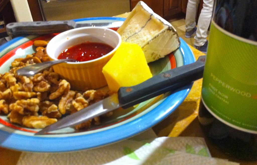 Pre-dinner nibbles include nuts, cheeses, sweet jalapeno sauce and a Pepperwood Pinot Noir