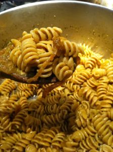 Not just whole wheat rotini pasta – in it is leftover caramelized onions, pesto that was in the fridge and the remnants of a bottle of Argentinian Malbec swished around with some water. Not so boring now, eh?