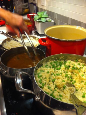 Braised beef on velvet mashed potatoes, peas risotto in the making