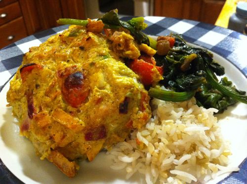 Ah, baked, fresh, wild-caught yellowtail tuna in a spicy curry yoghurt-based sauce, served atop a bed of basmati and brown rice, along with a fresh spinach bhaaji