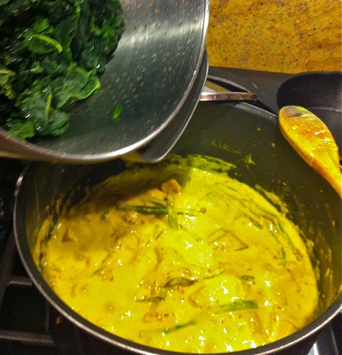 The curry now has shitake mushroom, rice wine, coconut milk, turmeric, sesame seeds and oil added to it. About to join the party is some very fresh kale.