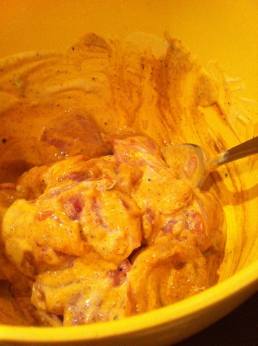 A little yoghurt-spice spot-marination for the chicken pieces: roasted cumin and coriander, fresh chillies, kosher salt, pepper, turmeric and yoghurt.