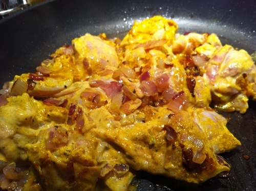 Caramelised the onion, ginger and garlic in 2 Tbps olive oil and then tossed in the chicken.