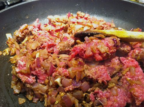 Sautéed onion-garlic-ginger invite in the ground beef!