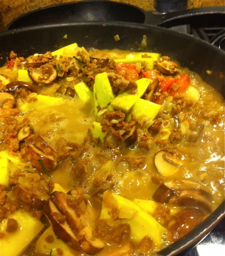 Spicy faux-beef is happening in some coconut milk with friends like crimini mushrooms, tomatoes, yellow zucchini/squash, ginger, onions, garlic, shallots. Scented with keffir lime leaf, 4 mean chillies and bunches of fresh mint. To be served up with thin rice noodles.