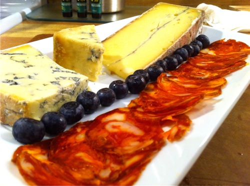 A little apéro plate of Spanish pata negra chorizo sliced paper thin, three cheeses: morbier, stilton and a blue, separated by a line of bleuets, just because I had them on hand.