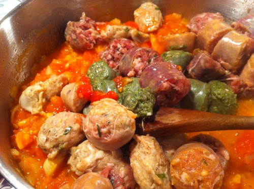 A variety of delicious sausages from the Atwater Market splashing around with onion and tomatoes and a dash or Marsala wine. The starring sausages are: cranberry and apple, spinach, veal and shallots, white wine and shallots.