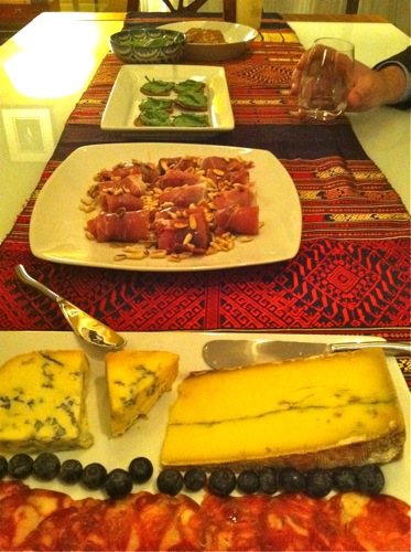 And this is just the beginning: little green crackers, fresh figs enrobed in prosciutto and toasted pine nuts (prepared by my guest I.), and the plate of charcuteries