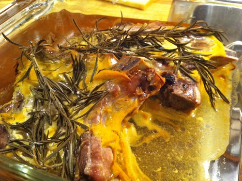 I.’s lovely contribution of pork chops marinated in dijon and fresh sprigs of rosemary. To be popped into the oven for 20-30 minutes.