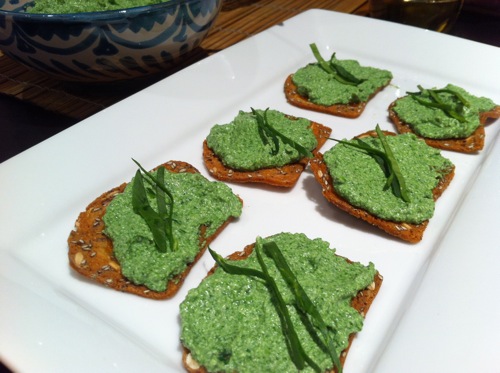 Little Green Crackers – apricot and multi-seed rainbow crisps topped with a mixture of homemade ricotta, wilted baby spinach and garlic.