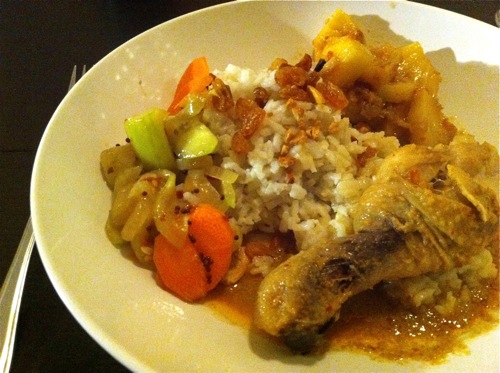 A Malaysian delight – chicken curry, nasi minyak, sambal nanas (pineapple with chilli, shrimp paste, shallots and garlic), and acartimun, a light overnight pickle made with cucumber, carrot, sauteed onion and mustard seed. Delicious!