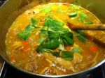 - Eradicating that cold/flu/sniffle. Simmering together: 1/4 chicken with bone, onion, carrot, celery, tomatoes, slivers of fresh ginger, whole cloves, bay leaf, chicken broth, one whole chili pepper, broad egg noodles and some green mâche thrown in there for fun! Total simmer time: 1hr.