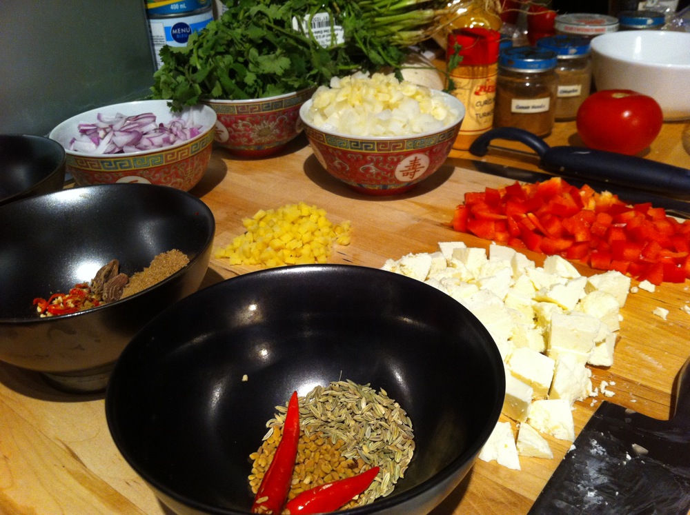 - Indo-Smörgåsbord: save time and confusion by organizing your spice mixes for each dish in pretty little bowls. Clockwise from bottom-left: fenugreek and fennel seeds and 2 whole chilies for the squash bhaji; chopped chilies, 2 black cardamon pods, cumin and coriander for the shrimp curry; cumin for the palak paneer. Then, we have red onion, fresh coriander, white onion and garlic, red bell pepper, fresh paneer and fresh ginger.