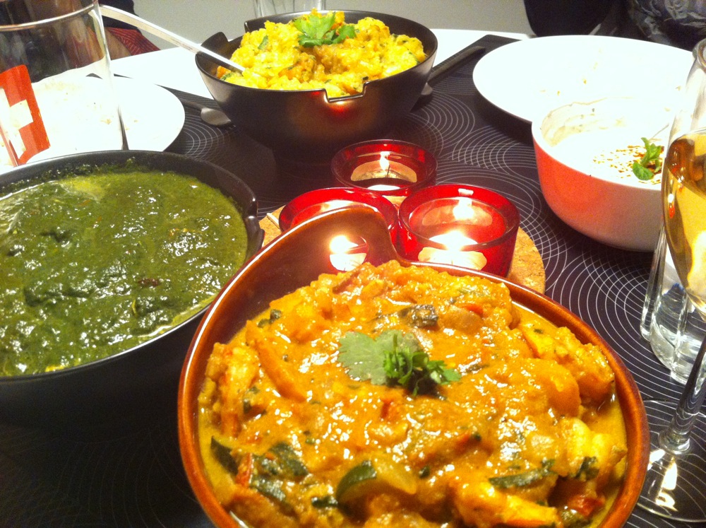 Et voilà! A sumptuous indian meal is served. Palak paneer, butternut squash and carrot bhaji/bharta, cucumber-mint raita, basmati rice and shrimp curry.