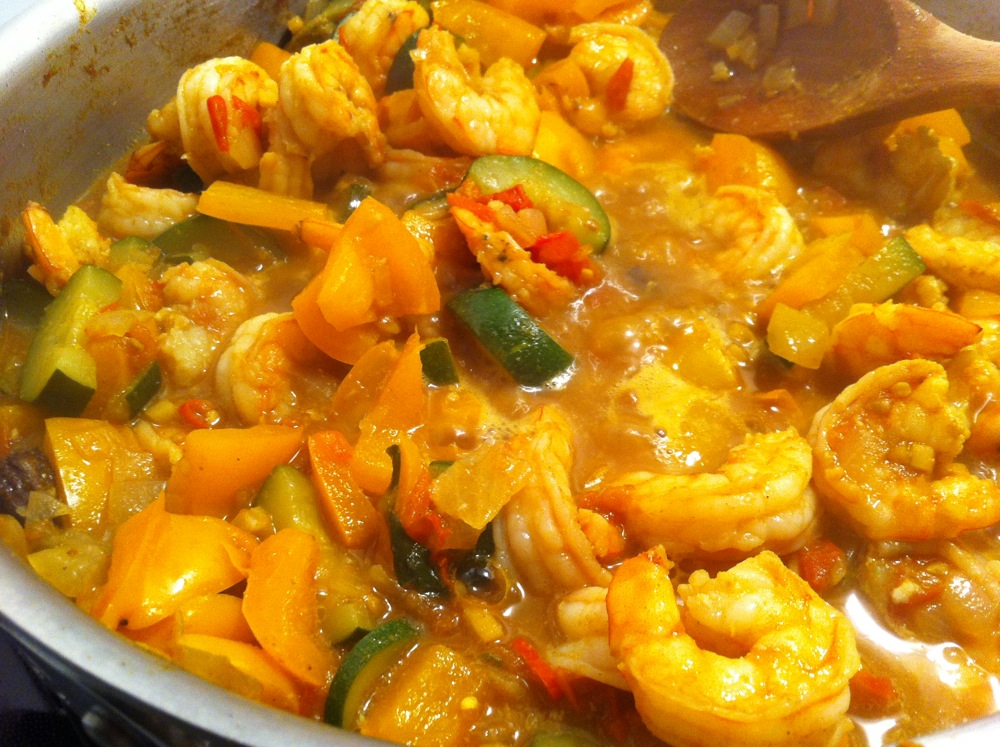 Exciting! Shrimp is getting curried in yoghurt with remarkable friends like zucchini, tomato, yellow bell pepper and ginger.