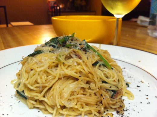 Behold this simple dish of cappellini with anchovies (in olive oil as well as their own), browned garlic and baby spinach blanched in with the pasta, graced with Parmesan and cooked up to the classic sounds of Kishore Kumar oldies. It was accompanied by an adorable salad of tomatoes, avocado and sunflower seeds and a good ol’ glass o’ wine. A satisfying dinner at the very end of a day working hard in a kitchen!