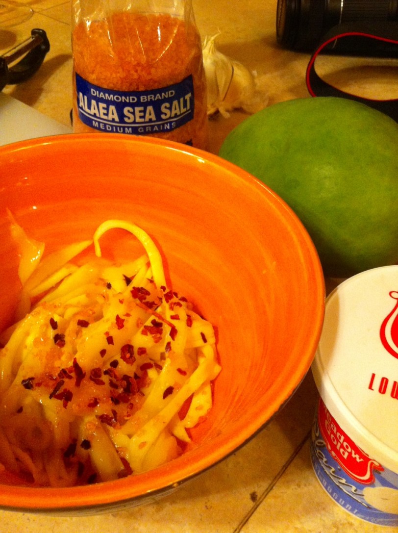 So, I found some green mangoes fallen off the tree on the front lawn of our vacation share in Maui, yesterday, (now, there’s a conversation starter), and I decided to employ them in our dinner. I decided to make a raita, julienning the green mango, adding a pinch of chili flakes, roasted cumin seeds and Alaea sea salt. Tangy and delish!