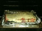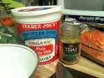 - Slather green curry-yoghurt-onion-lime paste onto salmon and pop into oven uncovered for 18 minutes at 425F. Make some basmati rice, in the meantime.
