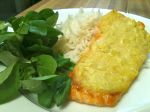 Baked green curry and yoghurt salmon with basmati rice and a side salad of mâche greens. Oh how interesting, mâche is also called “rapunzel”.