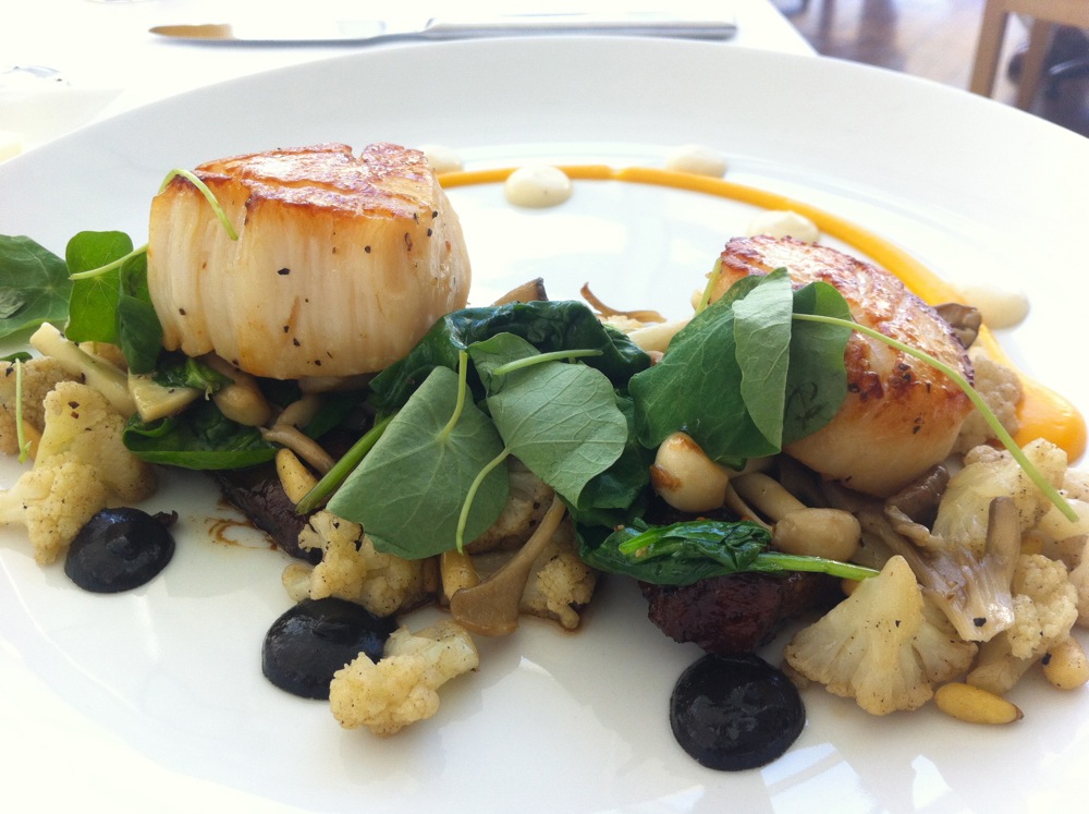 Gorgeous sea scallops seared to perfection on bits of braised beef with wild and crazy mushrooms and cauliflower