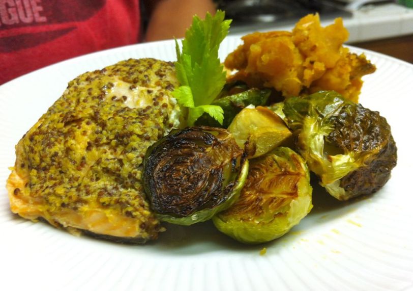 Here’s a lovely quick and easy weeknight dinner I made, starring: oven baked salmon in whole grain mustard, over roasted Brussels sprouts with garlic and sweet potato garlic mash. Yum. 🙂