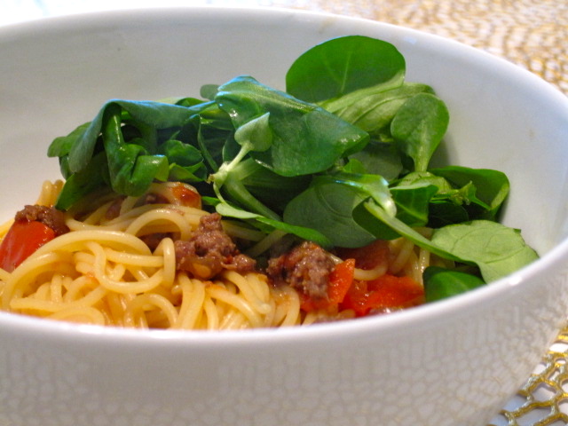 It’s my day for quick and fantastic small plates. Homemade (not by me) uncased spicy gruyère and porcini pork shortrib sausage sautéed quickly in olive oil with 3 Tbsp finely chopped red onion, 1 small tomato and a healthy dash of Marsala wine served over cappellini with fresh mâche greens for a colour pop (and vitamins).