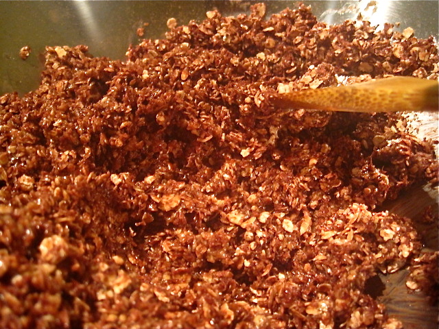 The melted butter and wet ingredients join the mix