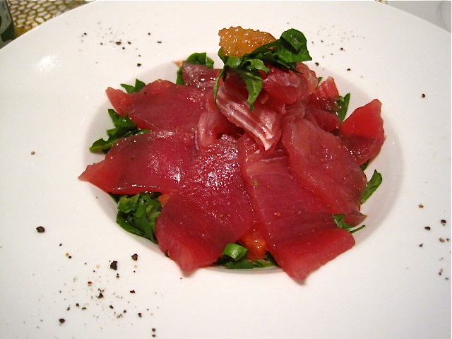 Ahi-trufflicious! Devilishly fresh Ahi tuna sashimi served atop a mattress of pink baby grapefruit sections with a mesclun chiffonade drizzled with truffle oil. (This is inspired by Chef Brock’s truffle hamachi).
