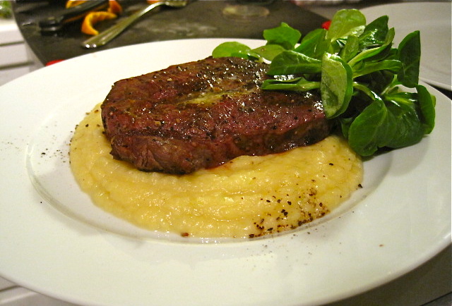 Flat iron steaks seared and finished in the oven, seasoned with Montreal steak spice, on a pillow of rutabaga, white sweet potato and fennel purée, served with mâche greens. I am especially proud of the rutabaga purée. 🙂