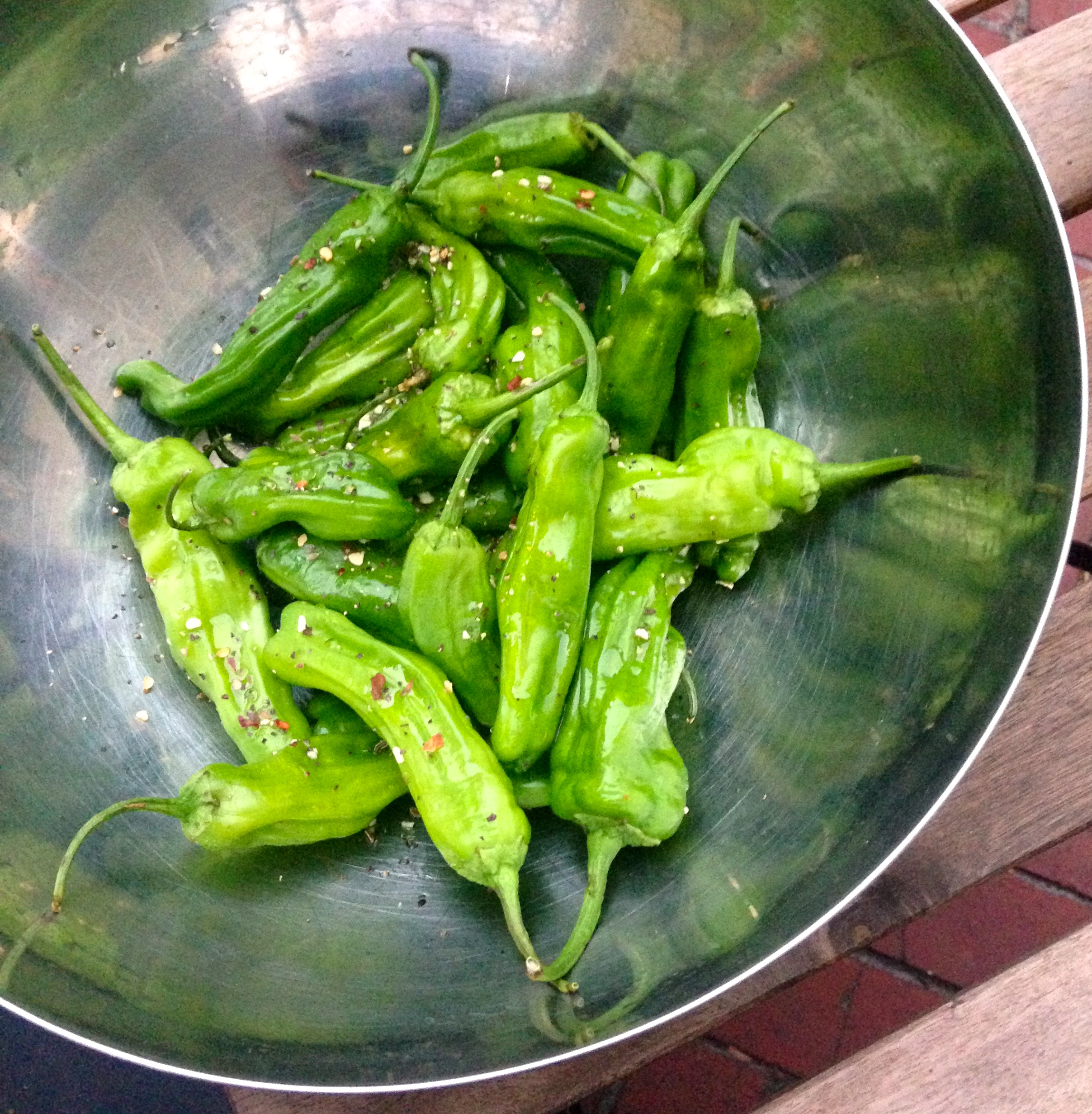Since I finally got the barbecue going, I have suddenly been looking for new and exciting things to barbecue. For example, these delectable shishito peppers. With only a slight natural kick, tossed in olive oil and Montreal steak space, they are fab! Barbecued so that the outer skin is charred just so and topped with a pinch of fleur de sel, I served it with a side of lightly herbed aïoli, yum!