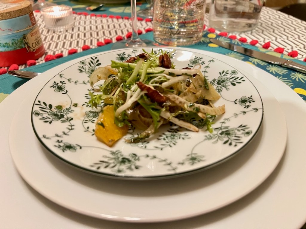 California local and seasonal, a refreshing, wintry salad of orange, shaved fennel and mint garnished with toasted pecans.