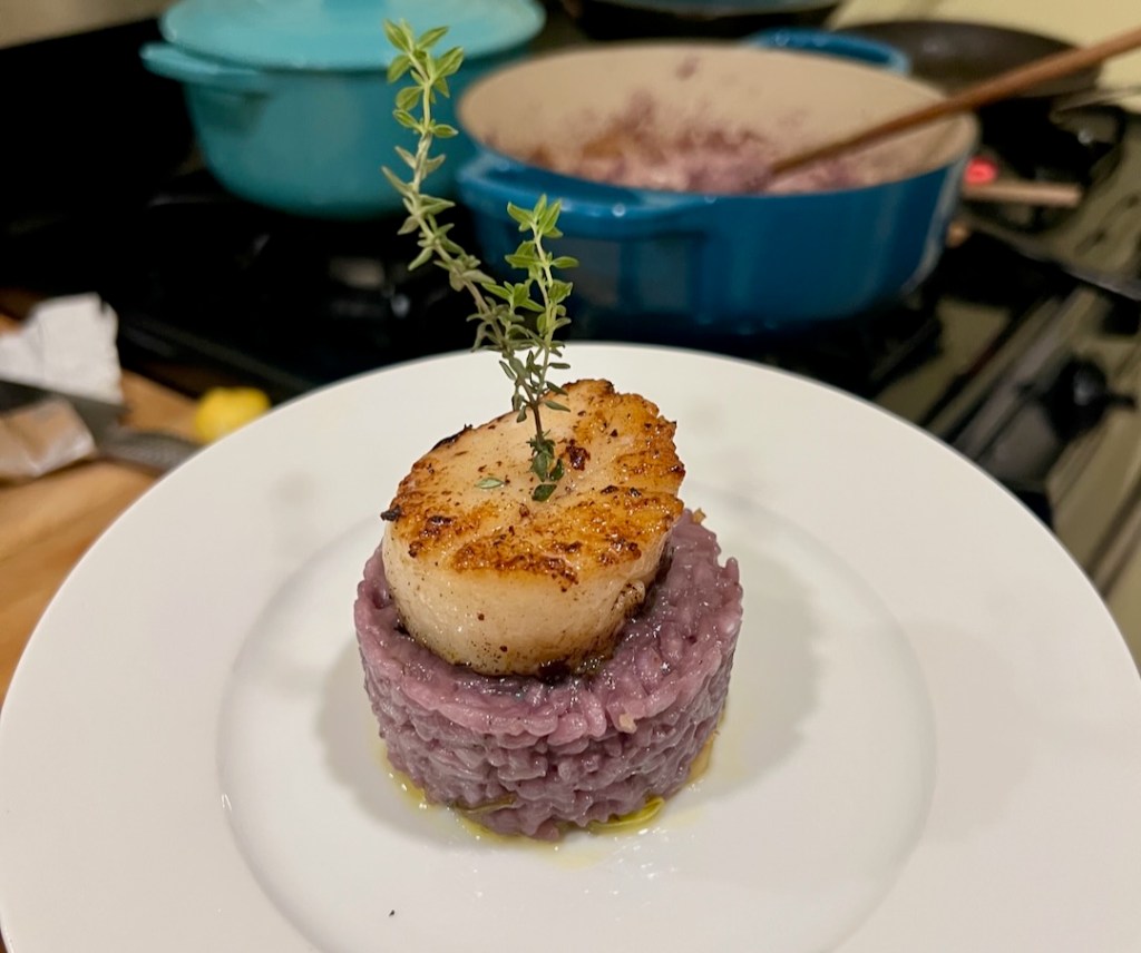 I have made strawberry risotto before, but I was inspired to try it with blueberries this time. Here we have a blueberry risotto on a bed of butter-braised leeks, topped with seared scallop in saffron, white wine and butter. Just look at that hue!